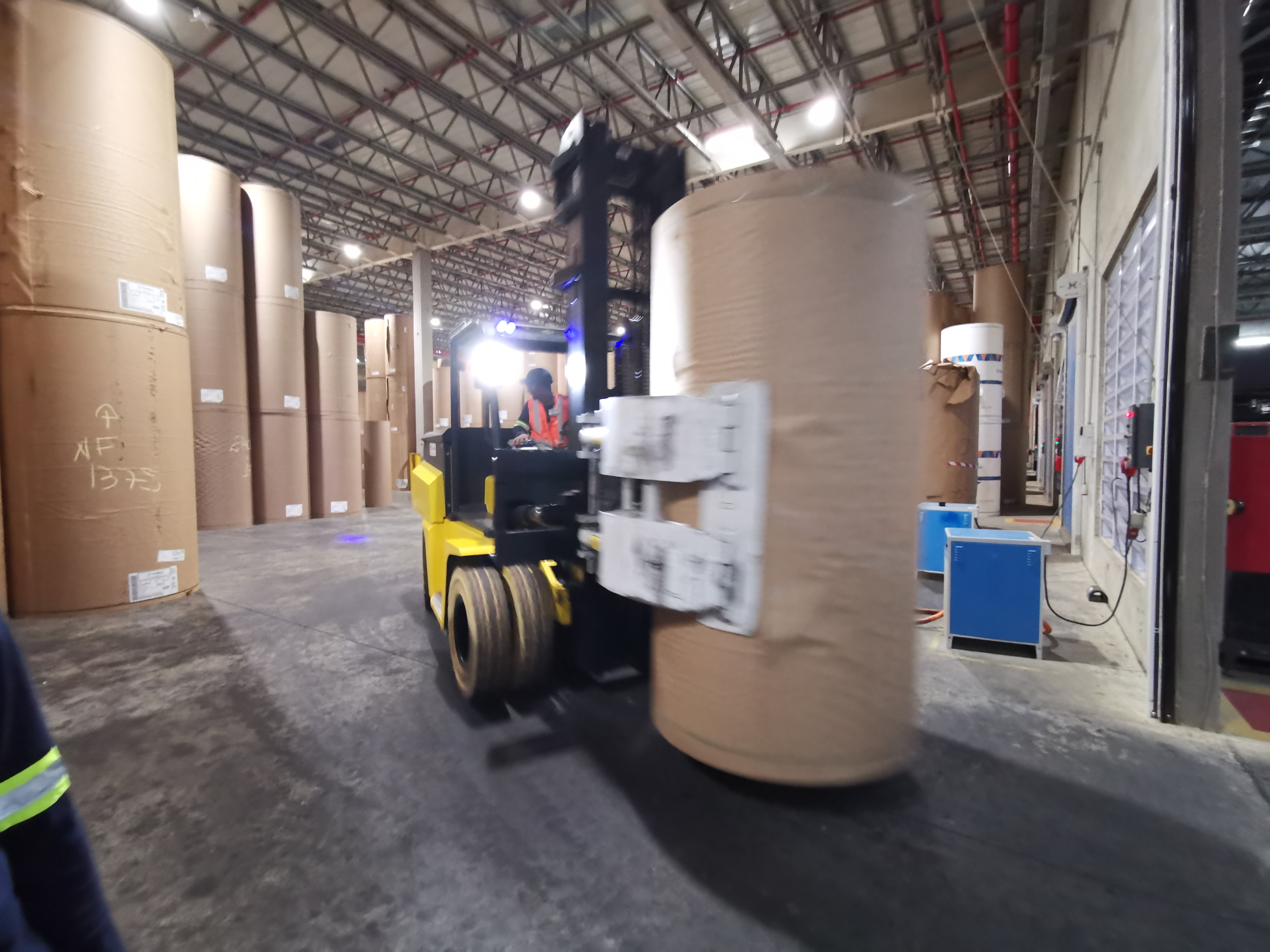 視頻中一位叉車司機正操作比亞迪叉車在夜里加班作業,用安裝了抱夾屬具的ECB70把紙筒搬運到倉庫內,以完成當天的入庫工作。